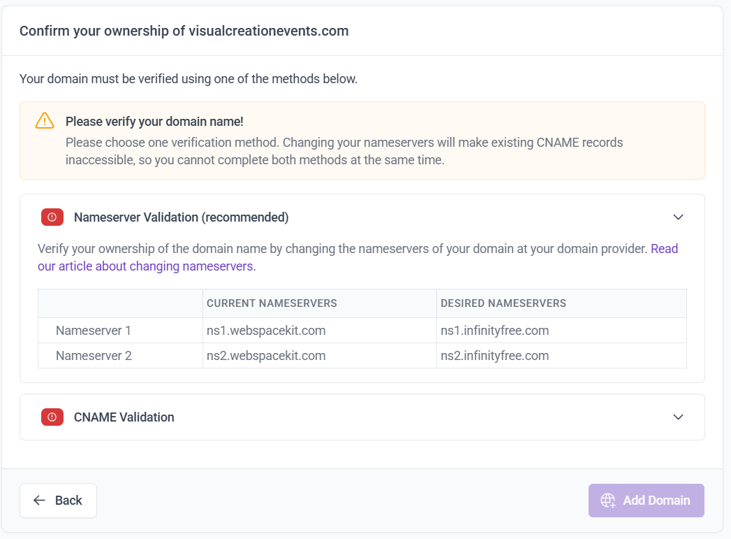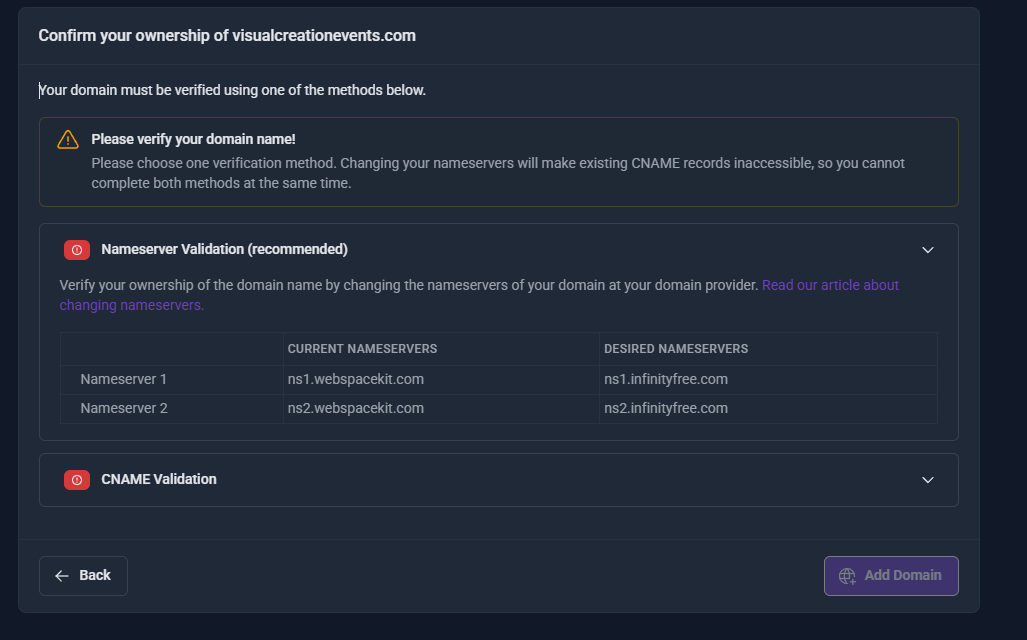 hey thanks for helping me till here but my mistake my wrong website, i was suppose to connect my Custom Domain “visualcreationevents.com” to my Subdomain website “visualcreationevents.wuaze.com” but by mistake its connected to new website and created its own.