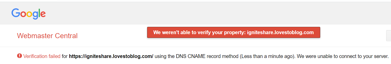 Verification failed for https://igniteshare.lovestoblog.com/ using the DNS CNAME record method (Less than a minute ago). We were unable to connect to your server.