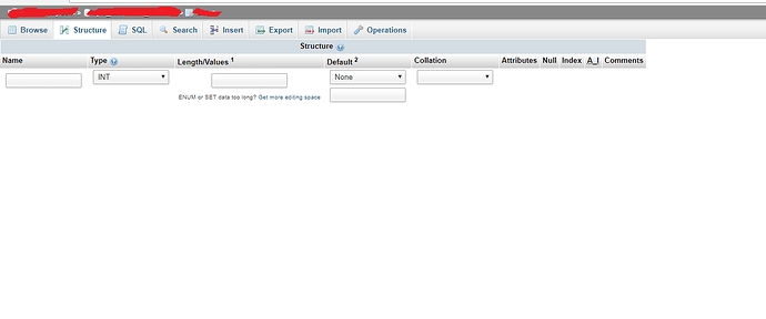 In the screenshot, I had clicked through menus to try to add a column to a table’s structure. When I got to the form to enter the details for that column, the interface only seems to load partway. Some selection menus/textboxes aren’t there, and the “Go” button isn’t there either.