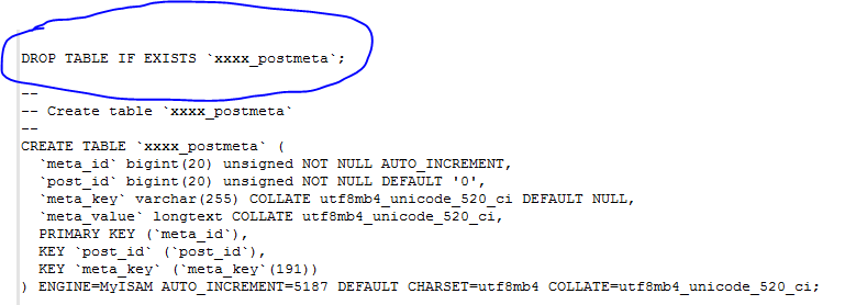 The Wordpress prefix must match your current installation. The drop table must match the name of table being created.