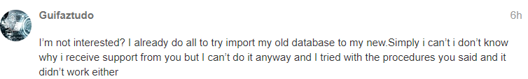 I’m not interested? I already do all to try import my old database to my new.Simply i can’t i don’t know why i receive support from you but I can’t do it anyway and I tried with the procedures you said and it didn’t work either