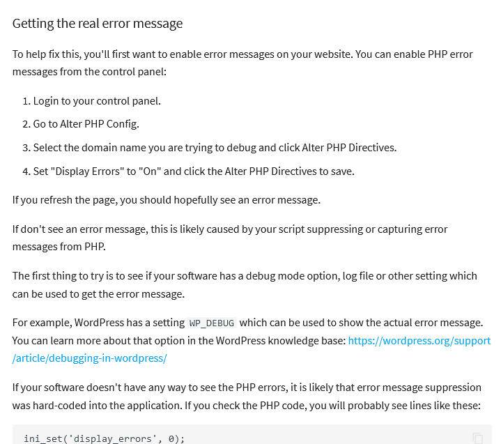 If a website is returning a HTTP error 500, it means the code is crashing. To see why, you can enable Display Errors for the site: