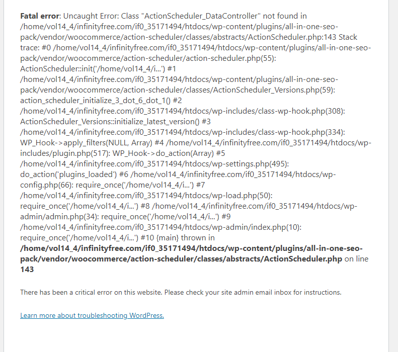 Your error here means that a class from within your plugin is not found, this could mean an incomplete upload. Meanwhile plugins that involve scheduling wonât work well here due to the lack of cron jobs. You might need to consider replacing the plugin as a whole.