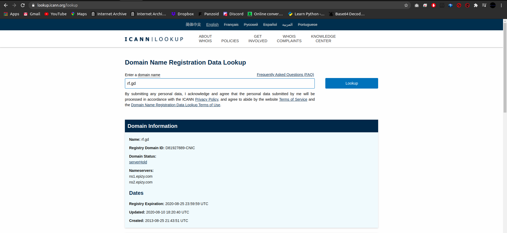 Since some time ago (presumably after) 17:00 UTC on August 10, the domain name rf.gd went down.