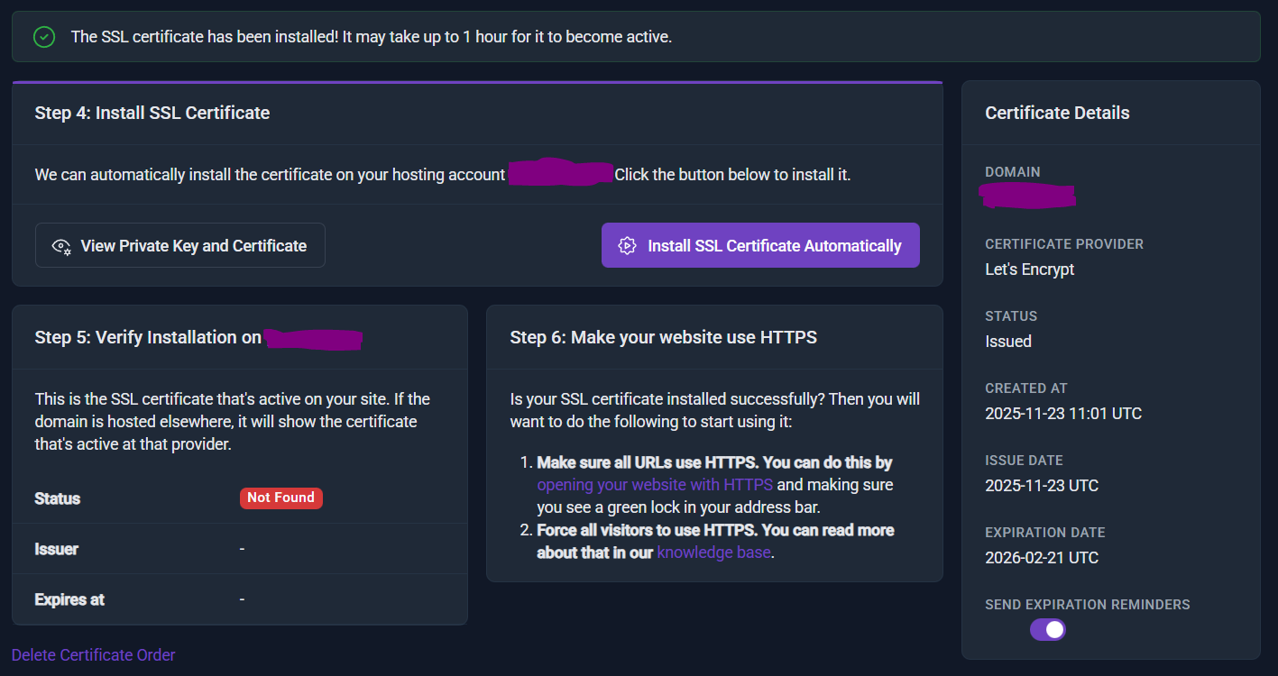 it’s been 3 hours since I ordered and automatically installed a certificate but it still doesn’t work. CNAME records are in place and so are keys in the CPanel, yet to no avail. Would anyone please mind helping me?