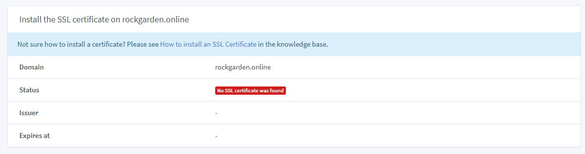 Generated Private Key and Certificate through both Let’s Encrypt and GoGetSSL. Also tried Self signing. In all cases after I upload the private key and then the corresponding certificate I do not get any error. However in the " Install the SSL certificate on rockgarden.online" it shows that the certificate is not installed as per below screen shot.
