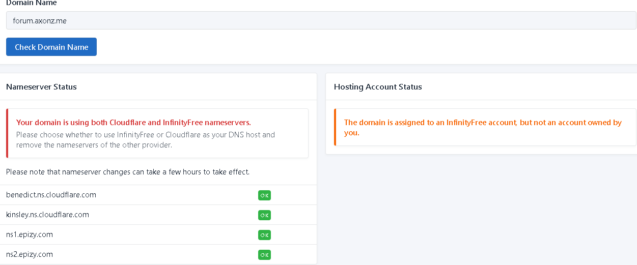 If you are using CF, remove the epizy nameservers. Make sure A or CNAME record is available for subdomain if using CF.