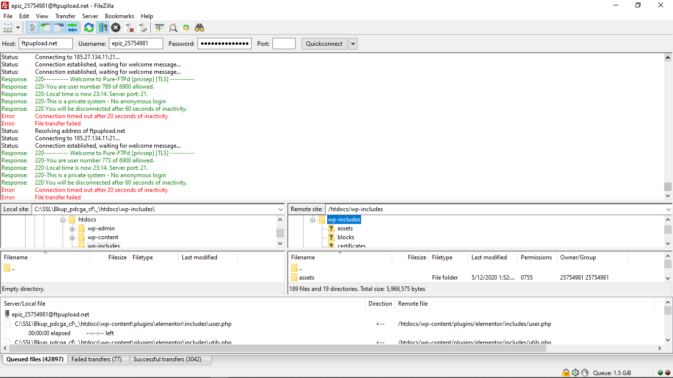 As shown in the following screendump, why the FTP transfer failed and cannot transfer wp-includes my domain pdcga.cf?