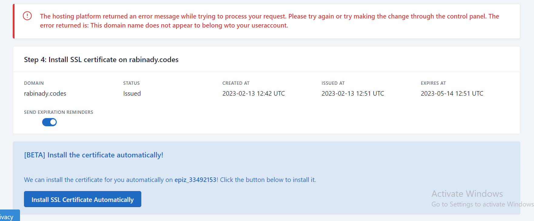 But the list of domains assigned to an account is only synchronized once per day, or whenever you hit the “Update List from Account” button in the Domains page of the particular account. So the automatic installer still thought your domain was using the old account.