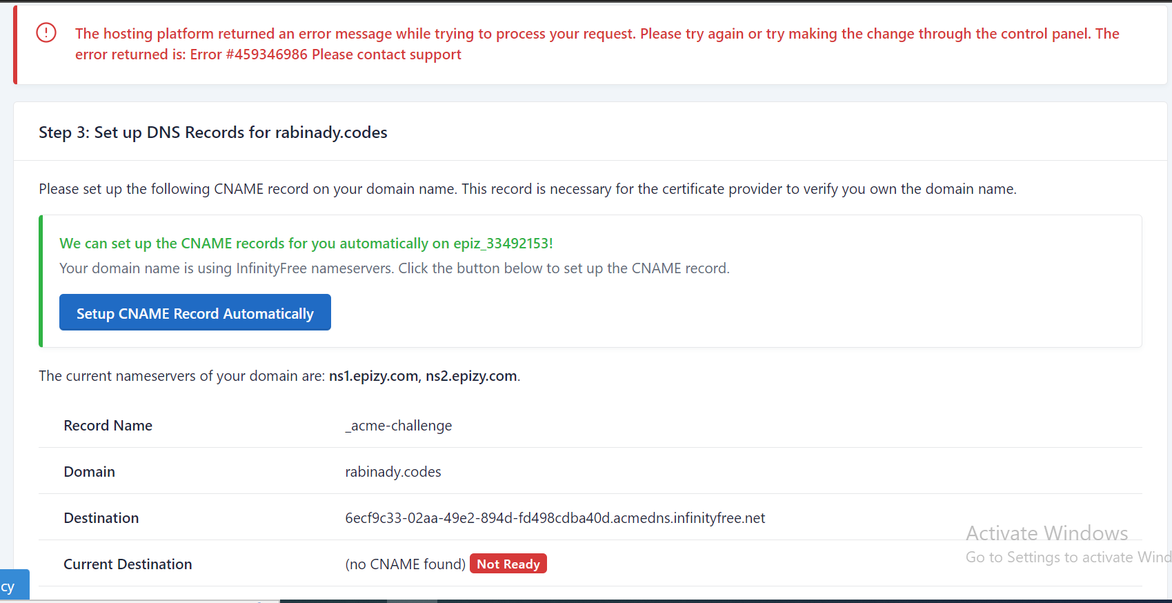 The hosting platform returned an error message while trying to process your request. Please try again or try making the change through the control panel. The error returned is: Error #459346986 Please contact support
