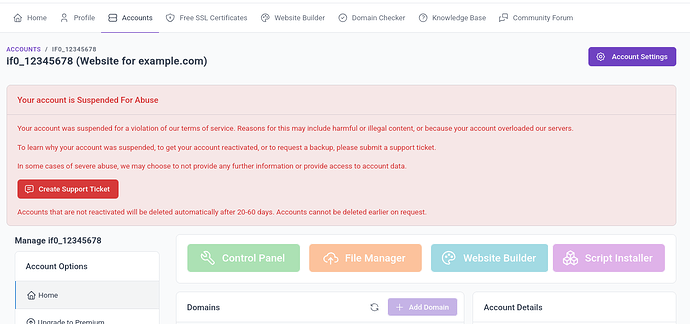 If its got the “Create Support Ticket” option, then its a permeant suspension, if its hits limits or similar and only a temp suspension, it wont have the button.