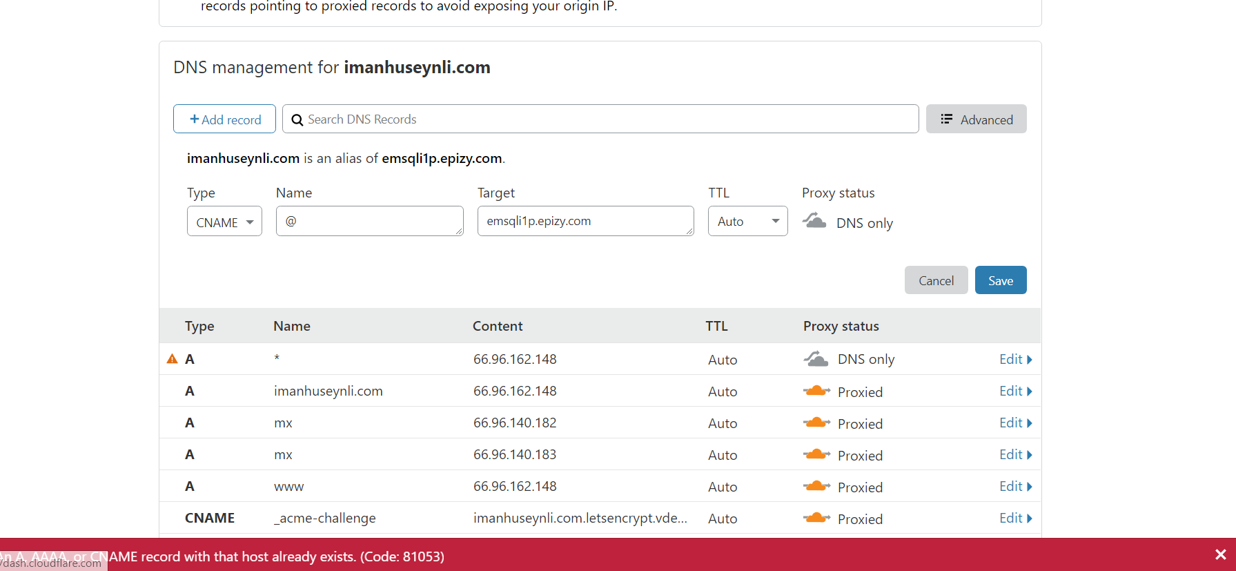 You will have to delete the existing records (except the CNAME records for SSL; to delete them just press “Edit” next to the record you want to delete then click on “Delete Record”), create a new CNAME record with name @ and as target your Main Domain (it can be found on your Control Panel) and another CNAME record with name www and target @. Make sure to leave the orange cloud untouched to have the Cloudflare benefits.