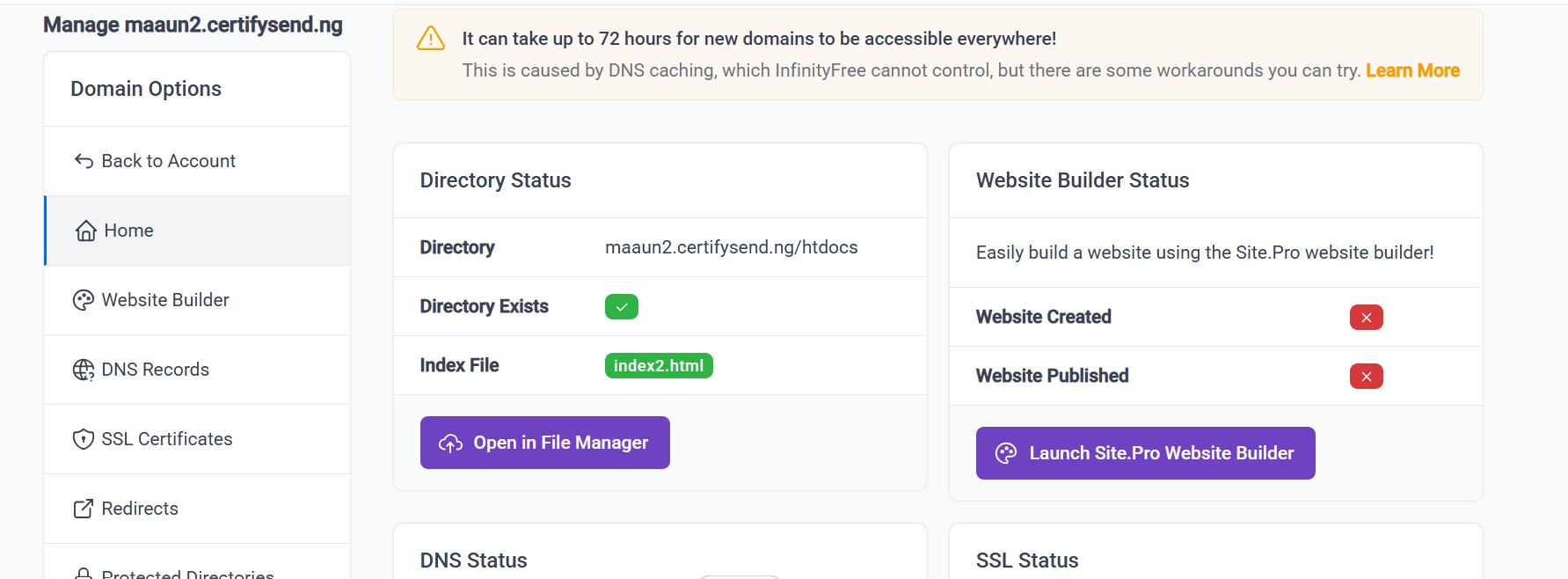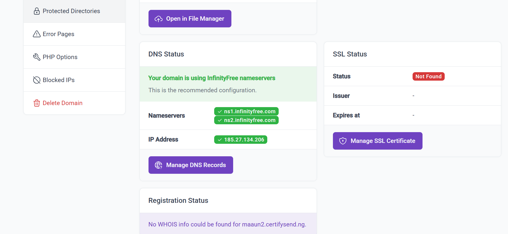Hello and welcome to the community. Can you share the DNS Status from this screenshot, on the lower left corner? Be sure it is pointing to InfinityFree server.