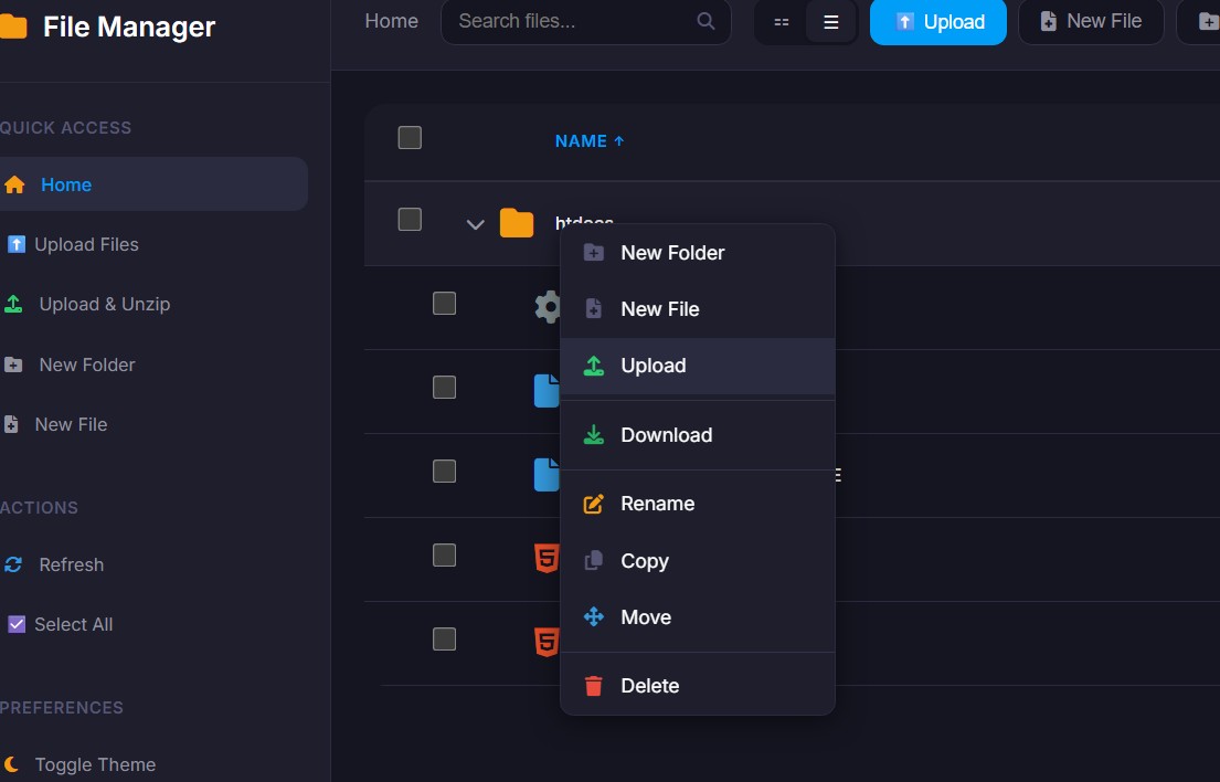 When I try to upload a file html under htdocs the message is ok but I canno see it in the file manager