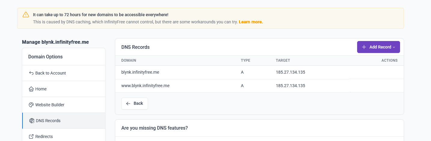 My site is still not available after 72 hours. I have .index file and the htdocs directory correct. The nameserver points to Infinity Free. I suspect it is the DNS records. There is no CNAME record available. See screenshot. Does anybody know?