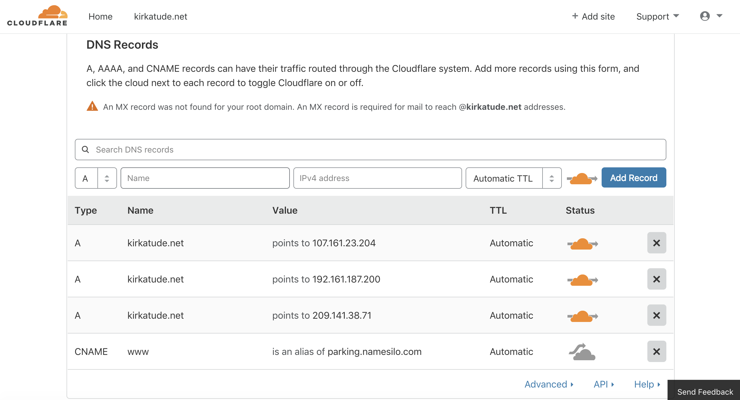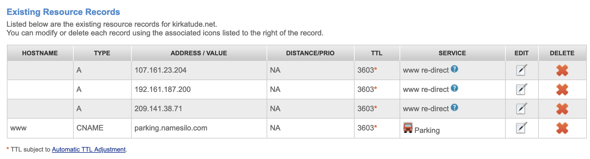 Hello. I went to CloudFlare where I have my DNS and clicked on, turned off, the cloud pointing using Namesilo, which is where I bought my domain. There seems to be 3 other “points leading to” my address. I don’t know if one of them is my ip address since I don’t know what that is. Should I delete the CNAME in Namesilo where my address seems to be parked? See the attached screenshots.